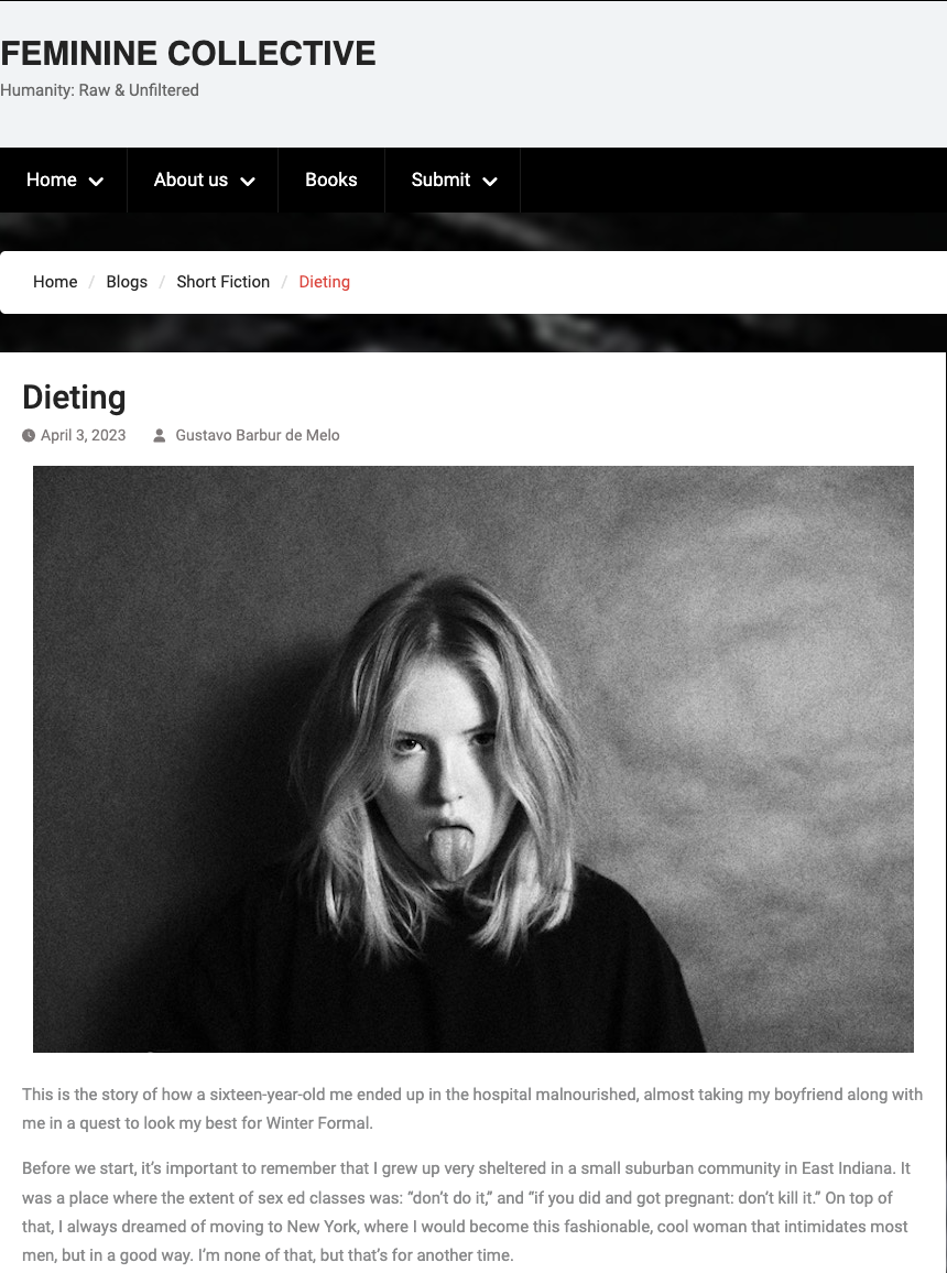 READ IT HERE“This is the story of how a sixteen-year-old me ended up in the hospital malnourished, almost taking my boyfriend along with me in a quest to look my best for Winter Formal.Before we start, it’s important to remember that I grew up very sheltered in a small suburban community in East Indiana. It was a place where the extent of sex ed classes was: “don’t do it,” and “if you did and got pregnant: don’t kill it.” On top of that, I always dreamed of moving to New York, where I would become this fashionable, cool woman that intimidates most men, but in a good way. I’m none of that, but that’s for another time.”