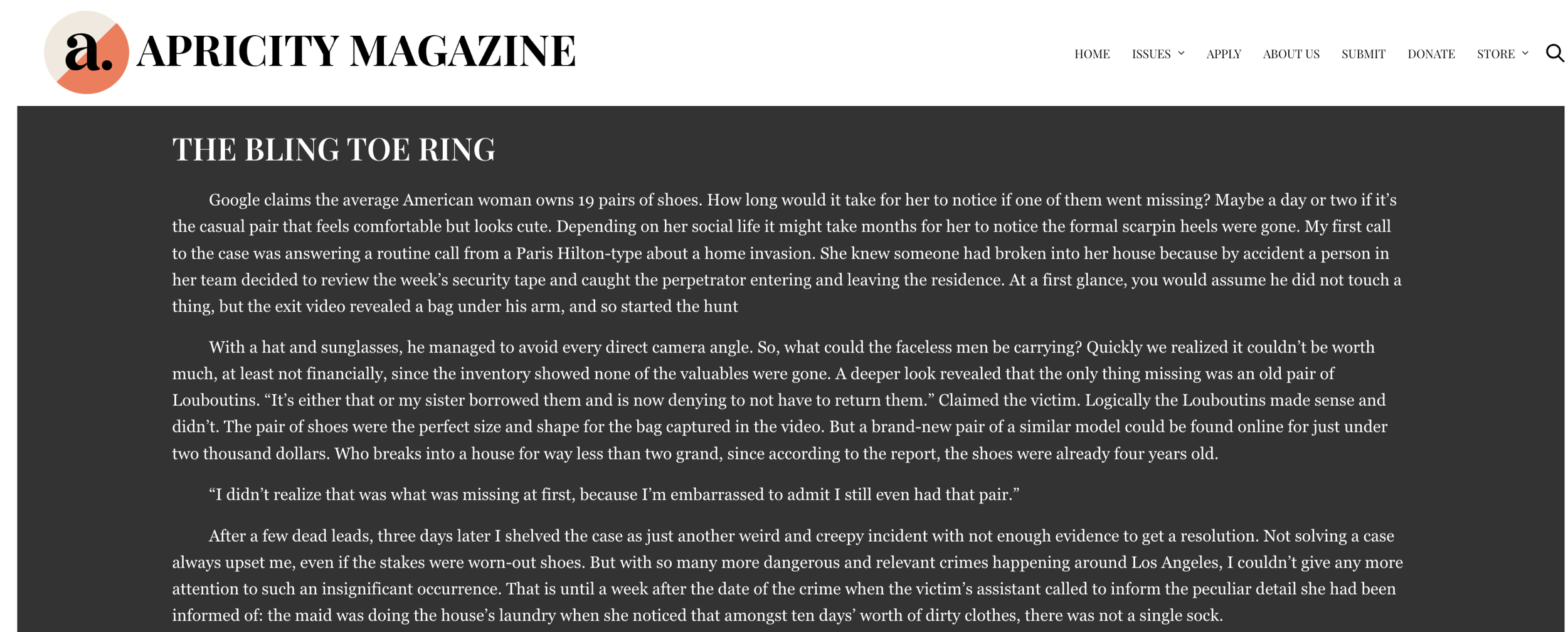 READ IT HERE“Google claims the average American woman owns 19 pairs of shoes. How long would it take for her to notice if one of them went missing? Maybe a day or two if it’s the casual pair that feels comfortable but looks cute. Depending on her social life it might take months for her to notice the formal scarpin heels were gone. My first call to the case was answering a routine call from a Paris Hilton-type about a home invasion. She knew someone had broken into her house because by accident a person in her team decided to review the week’s security tape and caught the perpetrator entering and leaving the residence. At a first glance, you would assume he did not touch a thing, but the exit video revealed a bag under his arm, and so started the hunt”